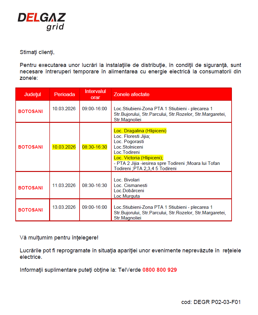 Intrerupere energie electrica Dragalina – 18.02.2026 09:00-17:00